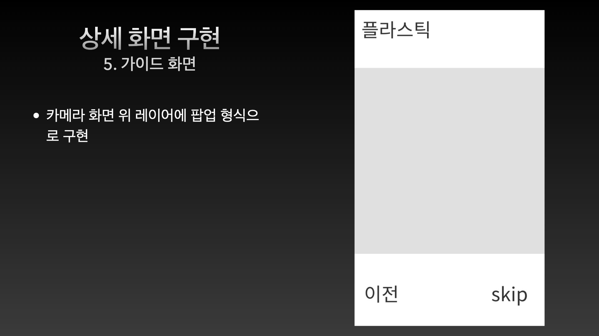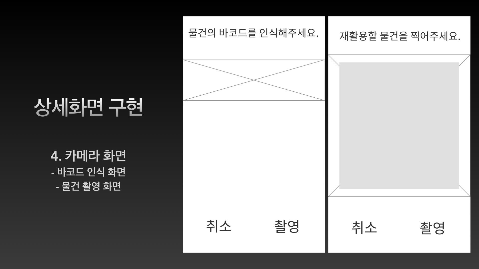 이번 모각소 3차 모임은 향후 개발 계획을 수립하기 위해서 팀원과 함께 UI 디자인을 구성해보았다. 사용자가 진행하는 관점으로 어떤 화면이 있어야하고, 그 화면에 어떤 기능, 위젯이 포함되어야하는지 같이 고민하고 결정했다. 나는 분리수거 가이드를 포함한 카메라 화면 구성을 담당했다. 구체적으로는 이미지를 사용자에게 받아와서 객체 인식 머신러닝 기술을 통해 사용자가 분리수거에 성공했는지 실패하는지 구분할 수 있도록하는 기능을 구현한다. 이를 구현하기 위해 앞으로 파이어베이스에서 어떻게 머신러닝 기능을 사용할지 학습할 예정이다.